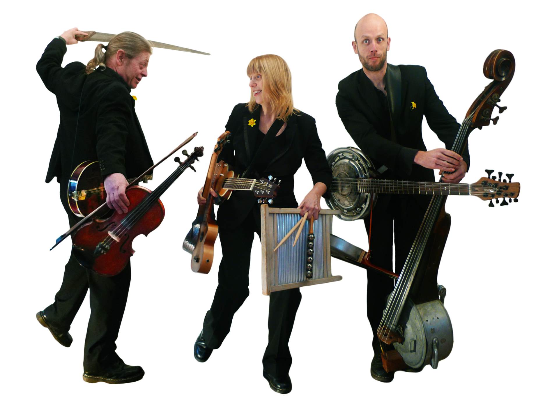 The three virtuoso musicians from England and France strut their stuff on a stage that bristles with instruments - adding flute, banjo, dulcimer, tin whistle, guitar, ukulele, stand up dustbin bass and a sackful of percussion to their ensemble. And let’s not forget the unique ‘bing-bong’ machine made out of hack-saw blades.